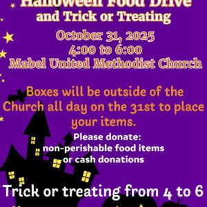 October 31, 2025 4:00 pm - 6:00 pmHalloween Food Drive & Trick or Treating – Mabel United Methodist Church