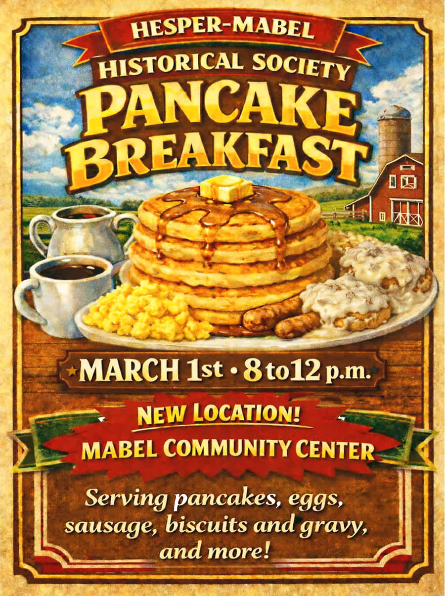 Hesper-Mabel Historical Society Pancake Breakfast + Add to Google Calendar + iCal / Outlook export Date Mar 01 2026 Expired! Time 8:00 am - 12:00 pm Category Mabel Events Share this event