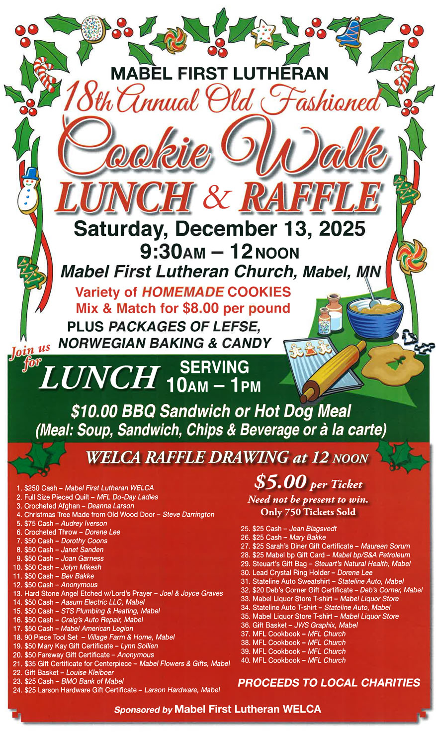 Mabel First Lutheran Cookie Walk, Lunch & Raffle + Add to Google Calendar + iCal / Outlook export 00 days 00 hours 00 minutes 00 seconds Date Dec 13 2025 Time 9:30 am - 12:00 pm Category Mabel Events Share this event