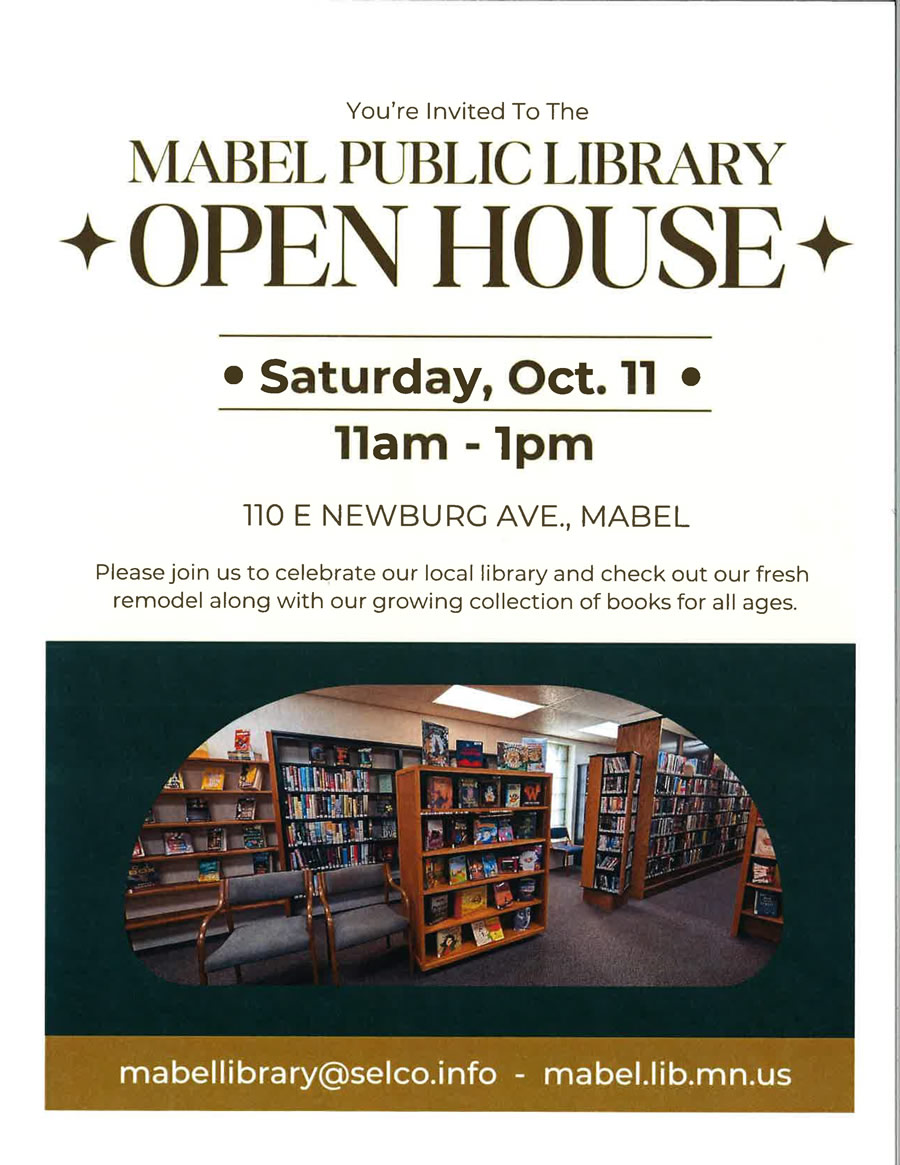 Mabel Public Library Open House + Add to Google Calendar + iCal / Outlook export Date Oct 11 2025 Expired! Time 11:00 am - 1:00 pm Category Mabel Events Share this event