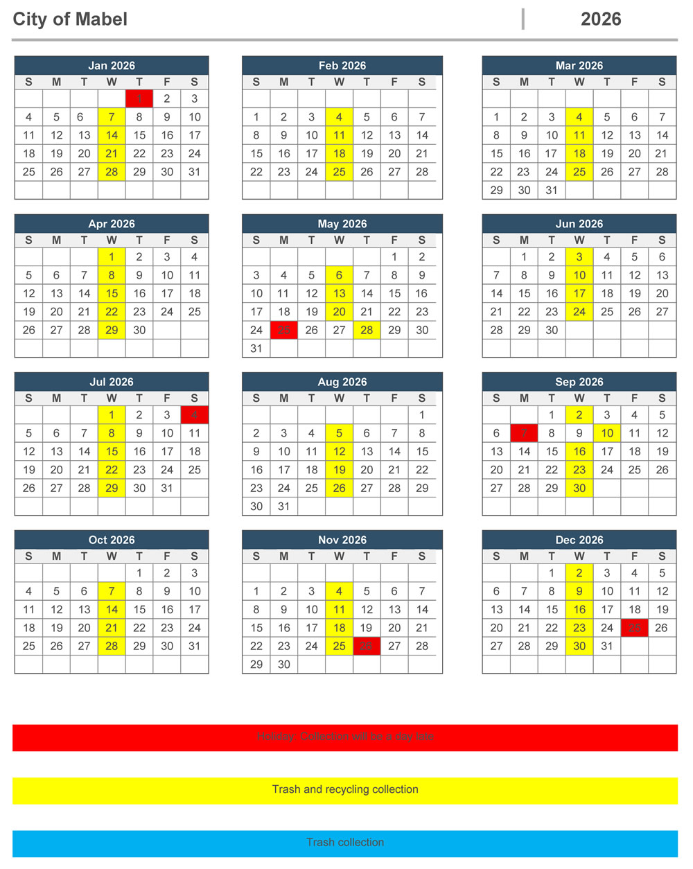Garbage and recycling bins must be placed out BEFORE 6:00 a.m. due to earlier collection times. This is a permanent change. If you have any questions with this, please contact Mabel City Hall.